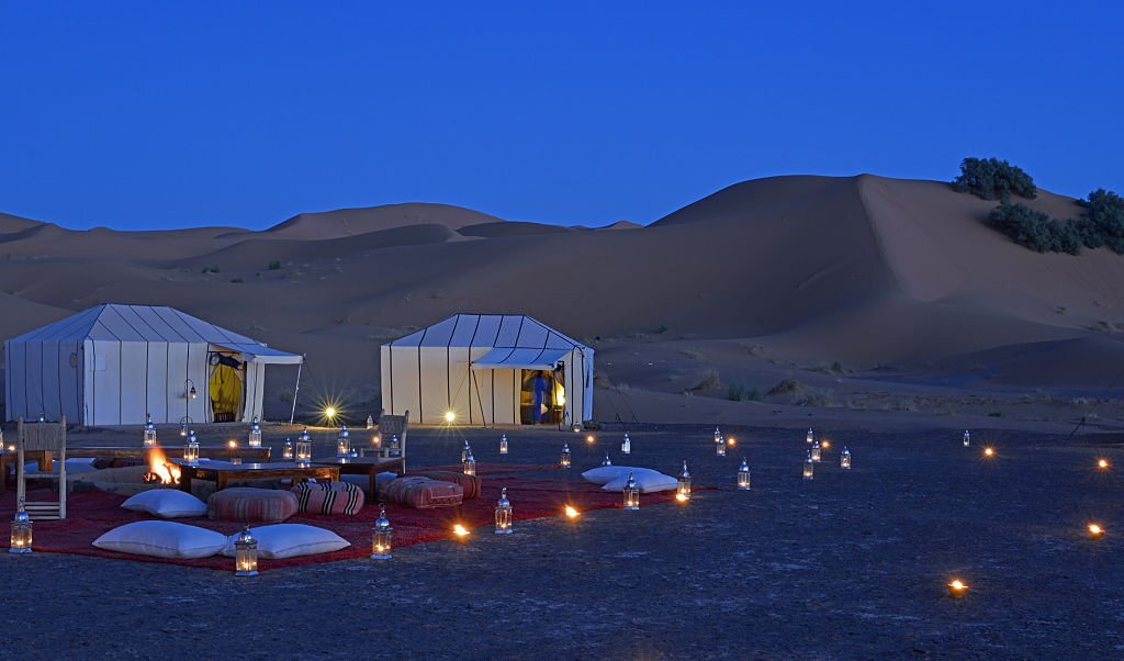 Fate un’escursione a dorso di cammello. Dimenticate per un po’ il trambusto delle città e organizzate un bivacco in mezzo alla sabbia in comode tende! Unitevi alle maestose dune di Merzouga: immergetevi nell’atmosfera magica e concedetevi un bagno di sabbia nel bel mezzo di uno scenario mozzafiato. Trascorrete la notte sul posto: al mattino, il sole sorge sulle dune formando uno scenario magico.