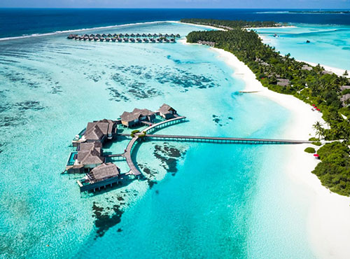 Las Maldivas están formadas por 1.192 islas de coral agrupadas en una doble cadena de 26 atolones, a lo largo de la dirección norte-sur, repartidas en unos 90.000 kilómetros cuadrados, lo que hace que sea uno de los países más dispersos del mundo. Se encuentra entre las latitudes 1°S y 8°N, y las longitudes 72° y 74°E. Los atolones se componen de arrecifes de coral vivos y barras de arena, situados encima de una cresta submarina de 960 kilómetros de largo que se eleva abruptamente desde las profundidades del océano Índico y se extiende de norte a sur.